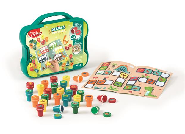 Nyomdázó készlet, foglalkoztató füzettel, bőröndben, MAPED CREATIV "Stamps", dinoszaurusz